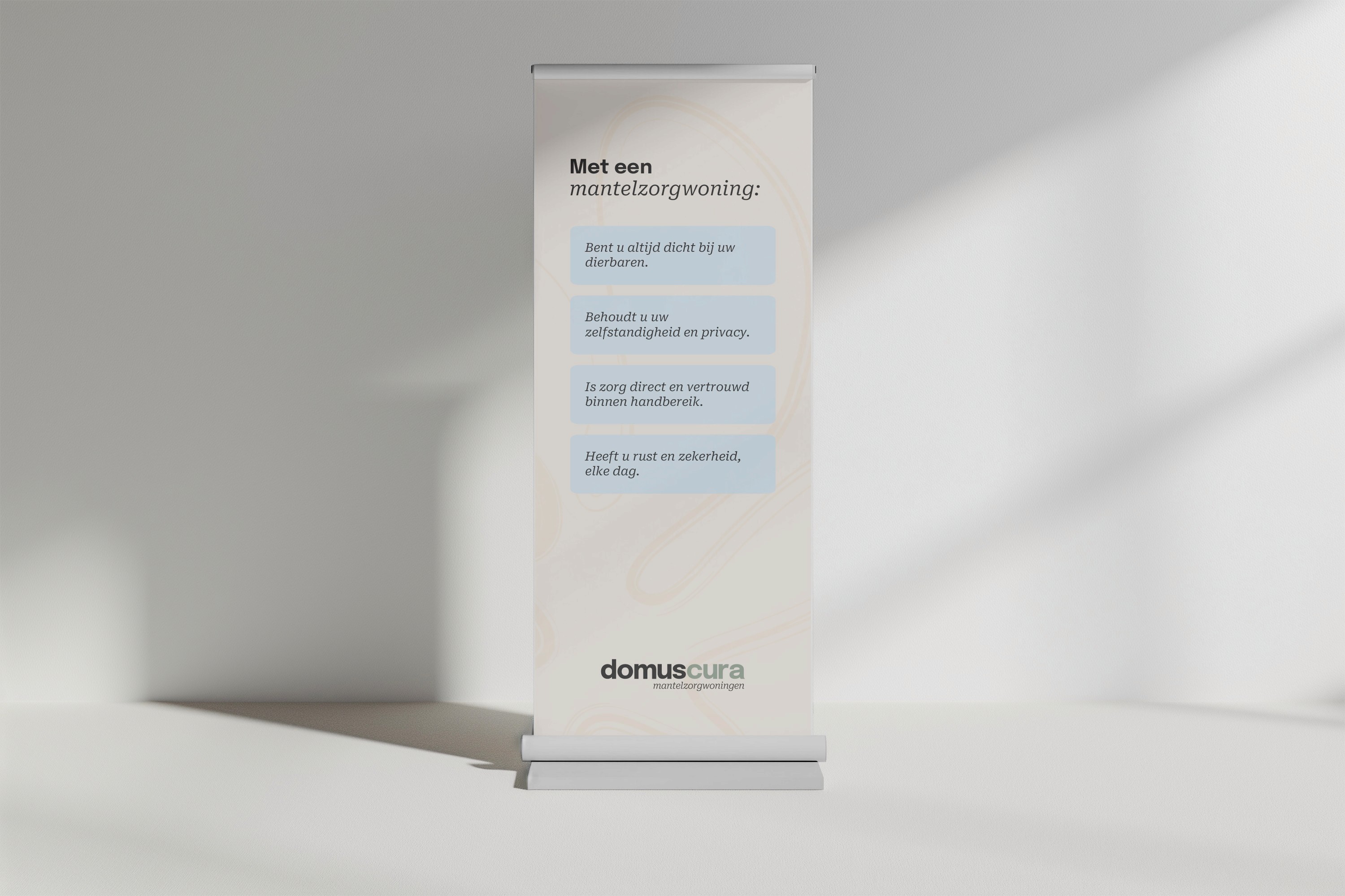 Voor Domuscura, specialist in mantelzorgwoningen, verzorgde Studio Bold een breed pakket aan communicatiemiddelen. Van tientallen brochures en visitekaartjes tot roll-up banners, signing en presentatiematerialen — alles ontworpen met oog voor overzicht, herkenbaarheid en praktische toepasbaarheid. Een veelzijdig traject waarin een professionele uitstraling en consistente doorvertaling centraal stonden, zowel in print als in presentatie.